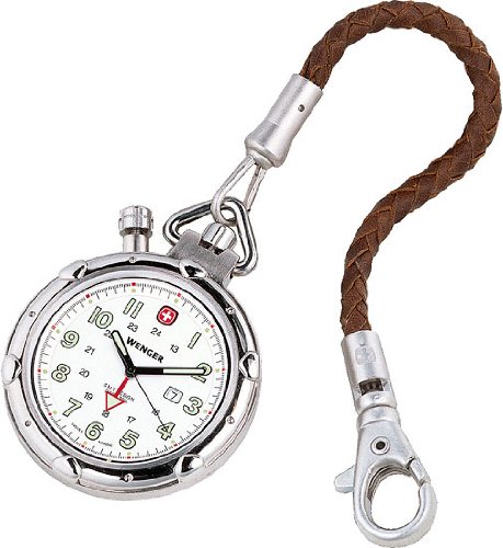About Wenger Watches Established in 1893 in Delémont in the Jura mountains of Switzerland, Wenger S.A. began as a supplier for the Swiss Army and is now one of only two official producers of the genuine Swiss Army knife. With the world renowned high standards of Swiss watchmaking, it was only a matter of time before Wenger moved into creating precisely tuned and carefully engineered timepieces. Since beginning in 1997, Wenger watches are now sold in 80 countries on all continents and its collection comprises the whole military sports spectrum. Bring back the timepiece tradition of the pocket watch with this Wenger Standard Issue model, created by the maker of the genuine Swiss Army Knife and offering craftsmanship that will last for years. The large silver watch case measures 48mm wide (1.9 inches) and it's topped by a raised bezel with compass-like accents. The easily readable white dial includes a full Arabic numeral display (with smaller inset 24-hour notations), small minute indexes around the exterior, date window at 3 o'clock, and luminous baton hands. It also includes another hour hand in red that sets the alarm. It connects securely to a belt loop via the braided leather lanyard strap with stainless steel clip, and it comes with a brown genuine calfskin leather pouch. Other features include the classic Swiss Army insignia at 12 o'clock, , scratch-resistant mineral crystal, and water resistance to 30 meters--enabling it to withstand splashes and accidental dunks into the water, but not suitable for swimming.